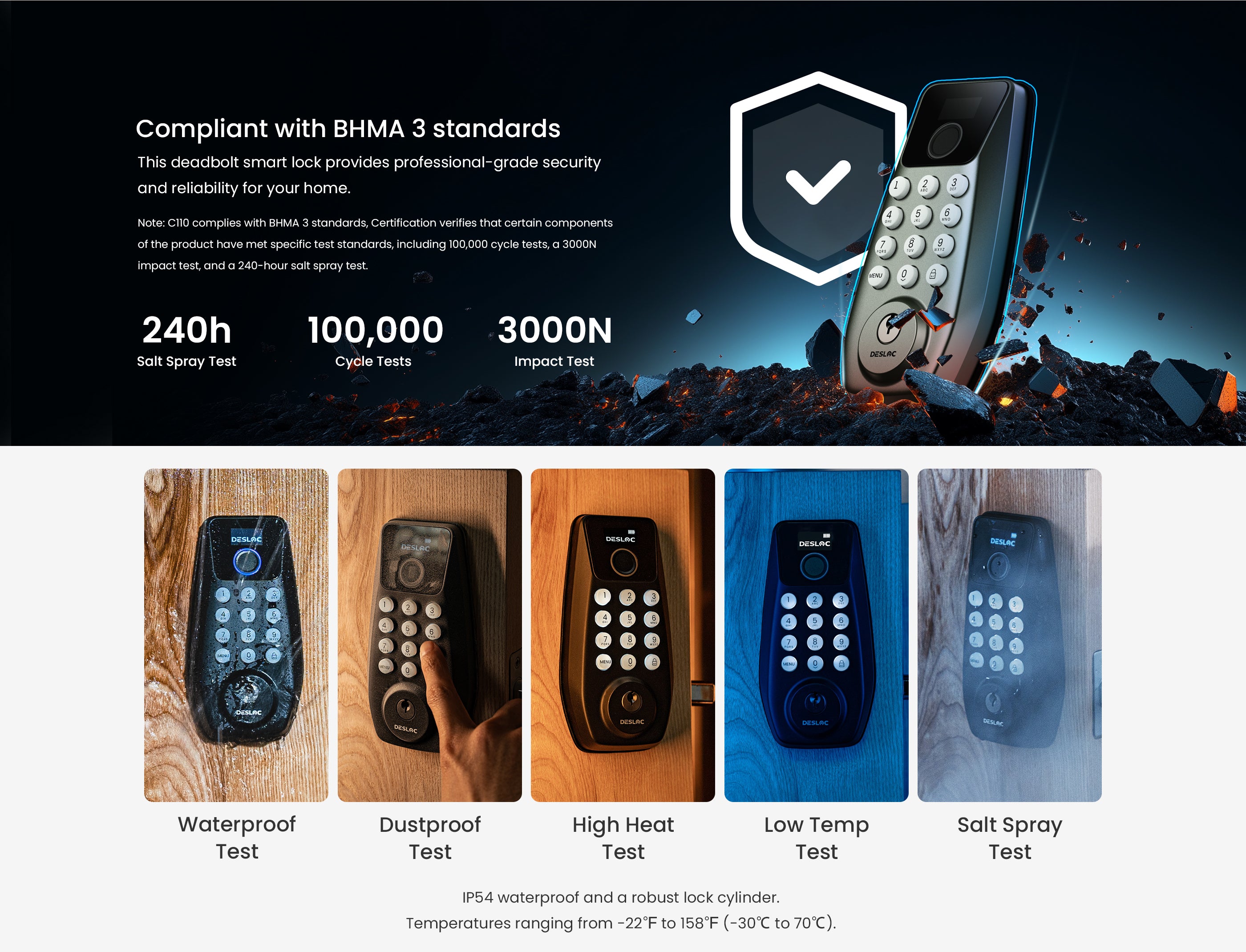 Seguridad premium en la que puede confiar: Esta moderna cerradura inteligente con cerrojo cuenta con certificación BHMA Grado 3 y está diseñada con un cilindro robusto, exterior con clasificación IP54, teclado con protección anti-espionaje y bloqueo automático. Nuestra tecnología FingerShield protege sus datos biométricos contra clonación y ataques. Elija la cerradura inteligente DESLOC C110 para proteger su hogar.