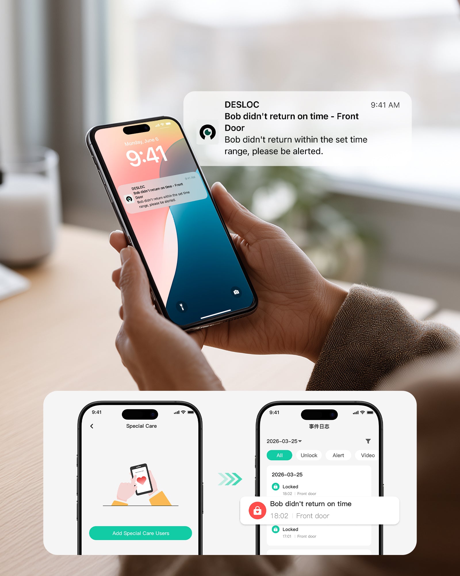 L'application DESLOC est entièrement compatible avec les serrures intelligentes D110 Plus et C100 Plus, assurant une configuration sans faille et un contrôle intelligent dans toute votre maison.
