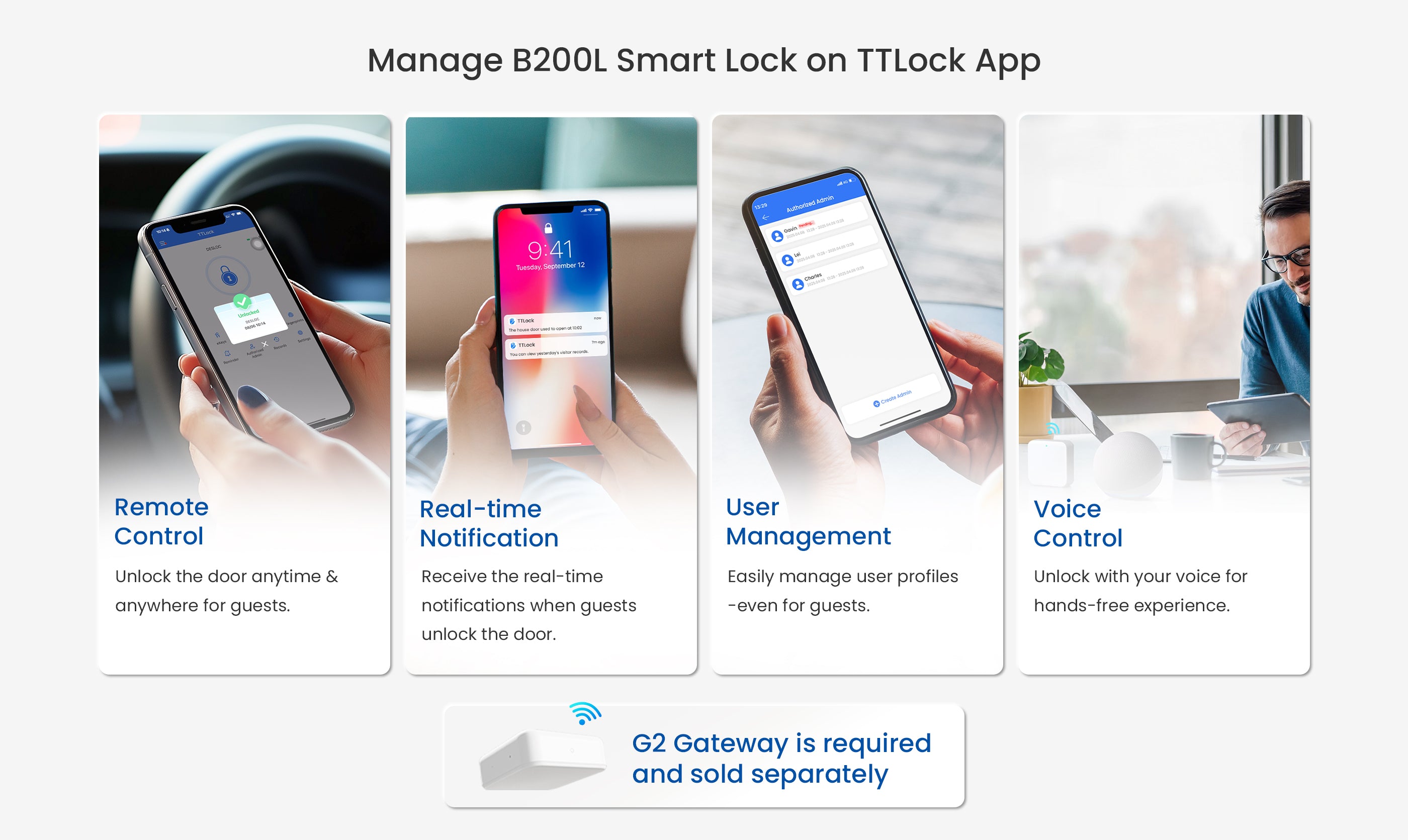 Contrôle à distance : Appairez-le en Bluetooth pour le contrôler via l’application TTLock dans un rayon de 2 mètres. Améliorez-le avec la passerelle G2 (vendue séparément) pour le contrôle à distance. La serrure connectée B200L permet de générer des codes d’accès temporaires à des heures programmées pour vos amis ou vos invités.