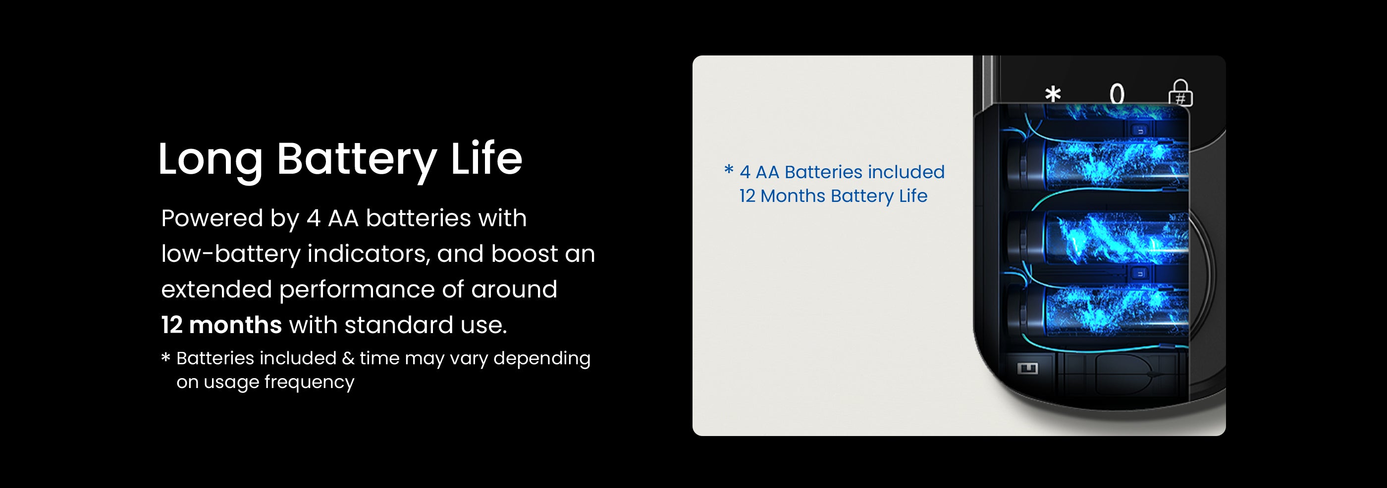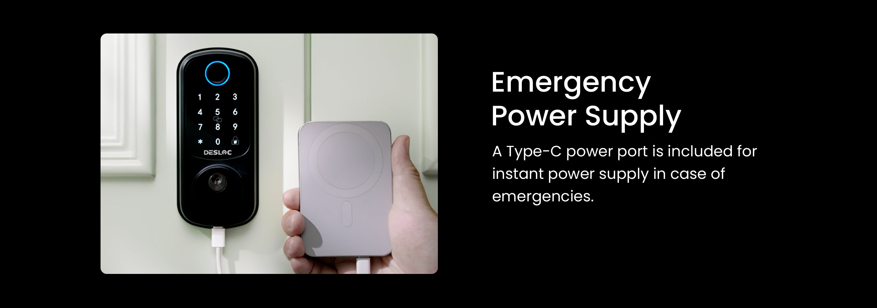 𝟏𝟐 𝐌𝐨𝐧𝐭𝐡𝐬 𝐁𝐚𝐭𝐭𝐞𝐫𝐲 𝐋𝐢𝐟𝐞:With 4 AA batteries (not included), DESLOC smart door lock runs around 12 months, with a built-in low-battery indicator and USB Type-C emergency power port.