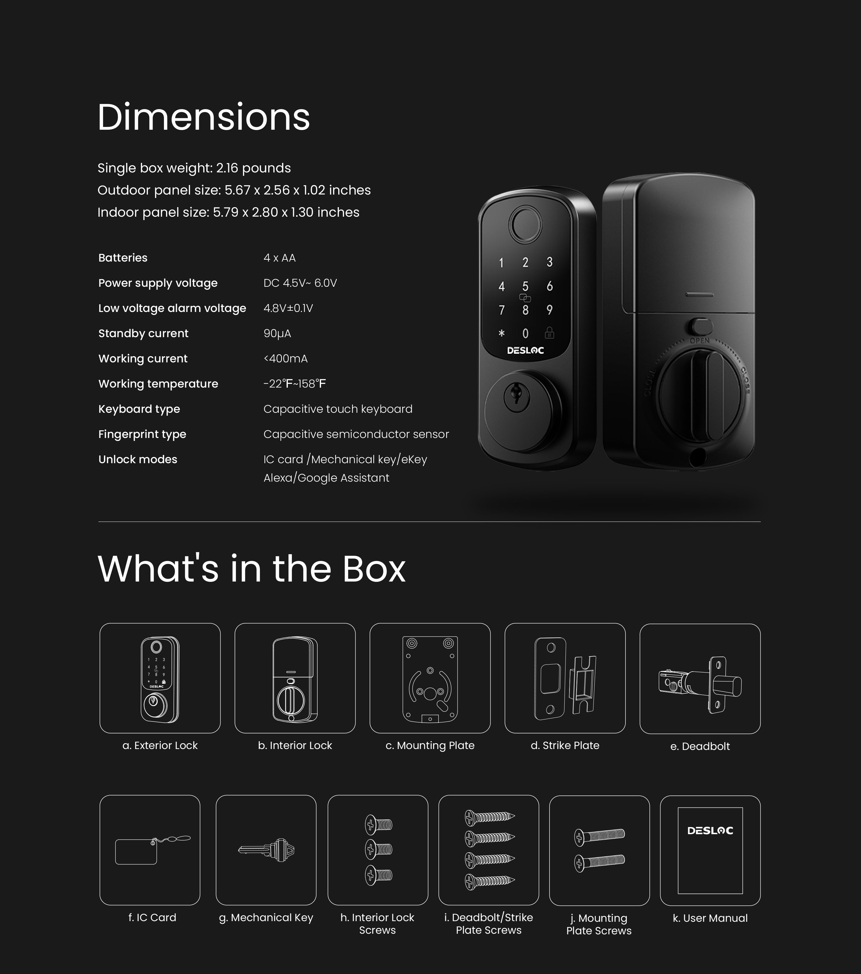 𝐄𝐚𝐬𝐲 𝐈𝐧𝐬𝐭𝐚𝐥𝐥𝐚𝐭𝐢𝐨𝐧 𝐚𝐧𝐝 𝐄𝐱𝐜𝐞𝐥𝐥𝐞𝐧𝐭 𝐂𝐮𝐬𝐭𝐨𝐦𝐞𝐫 𝐒𝐞𝐫𝐯𝐢𝐜𝐞: Install DESLOC fingerprint door lock in minutes by only a screwdriver. Interior lock back cover with adhesive for hands-free setup. DESLOC offers a 12 months product warranty and a lifetime after-sales service. Contact us via hotline (Mon-Fri, 9am-5pm EST) or 24/7 email support.