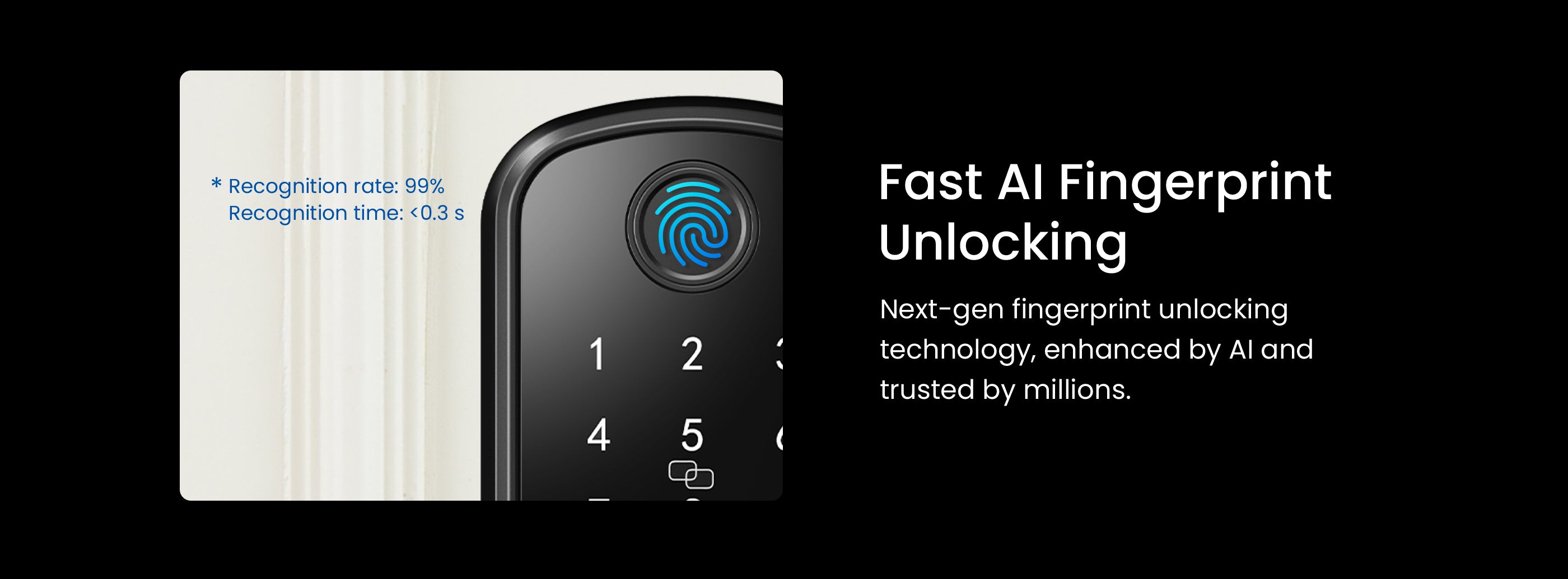 𝐔𝐧𝐥𝐨𝐜𝐤 𝐰𝐢𝐭𝐡 𝐄𝐚𝐬𝐞 & 𝐒𝐞𝐥𝐟-𝐥𝐞𝐚𝐫𝐧𝐢𝐧𝐠 𝐀𝐈: Unlock with fingerprint recognition, PIN codes, physical keys, app control, eKey, fobs, or use your voice with Alexa / Google Voice Assistant. For Deadbolt Smart Lock B200, the speed of fingerprint recognition is less than 0.3s. Next-generation fingerprint unlocking technology, upgraded through AI learning and validated by millions of users.