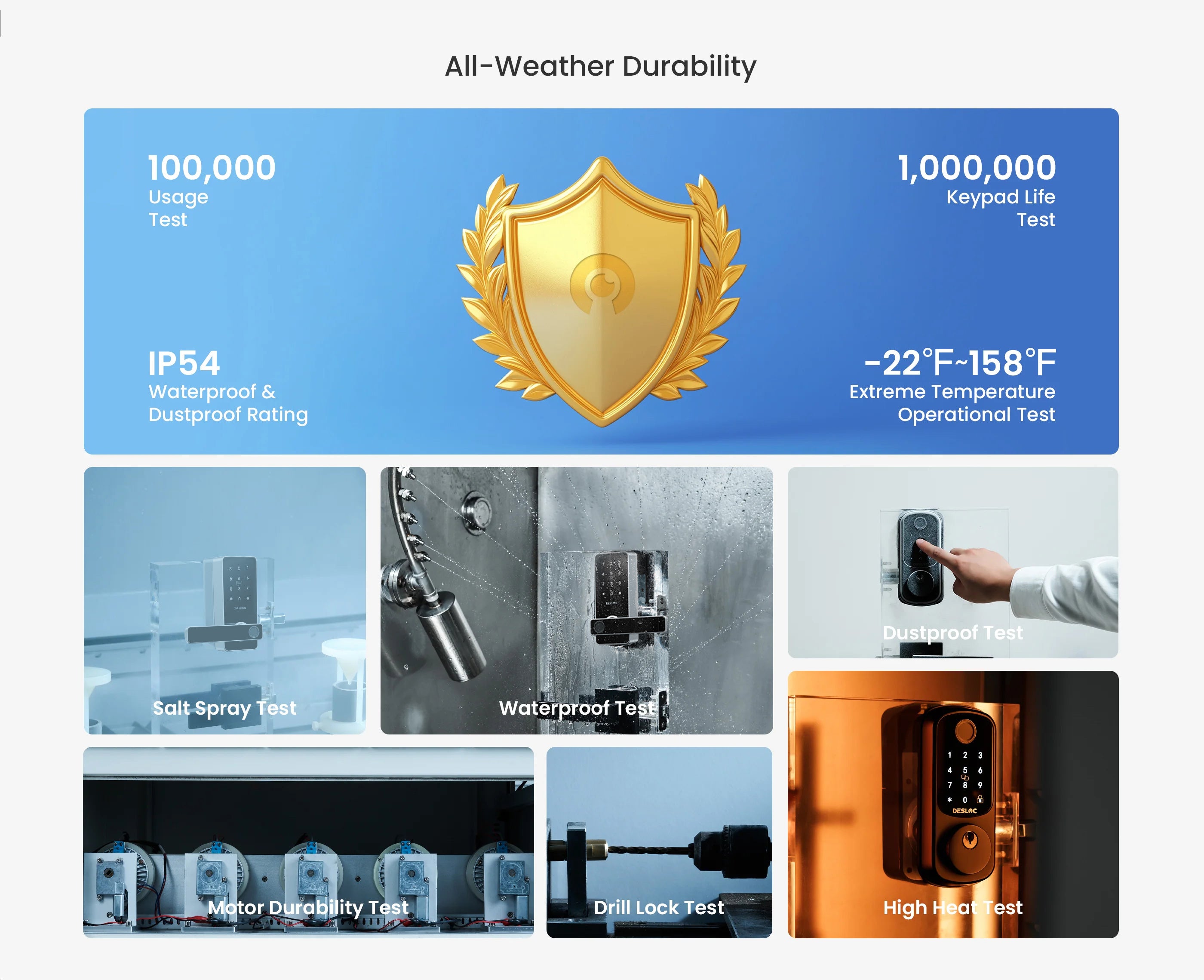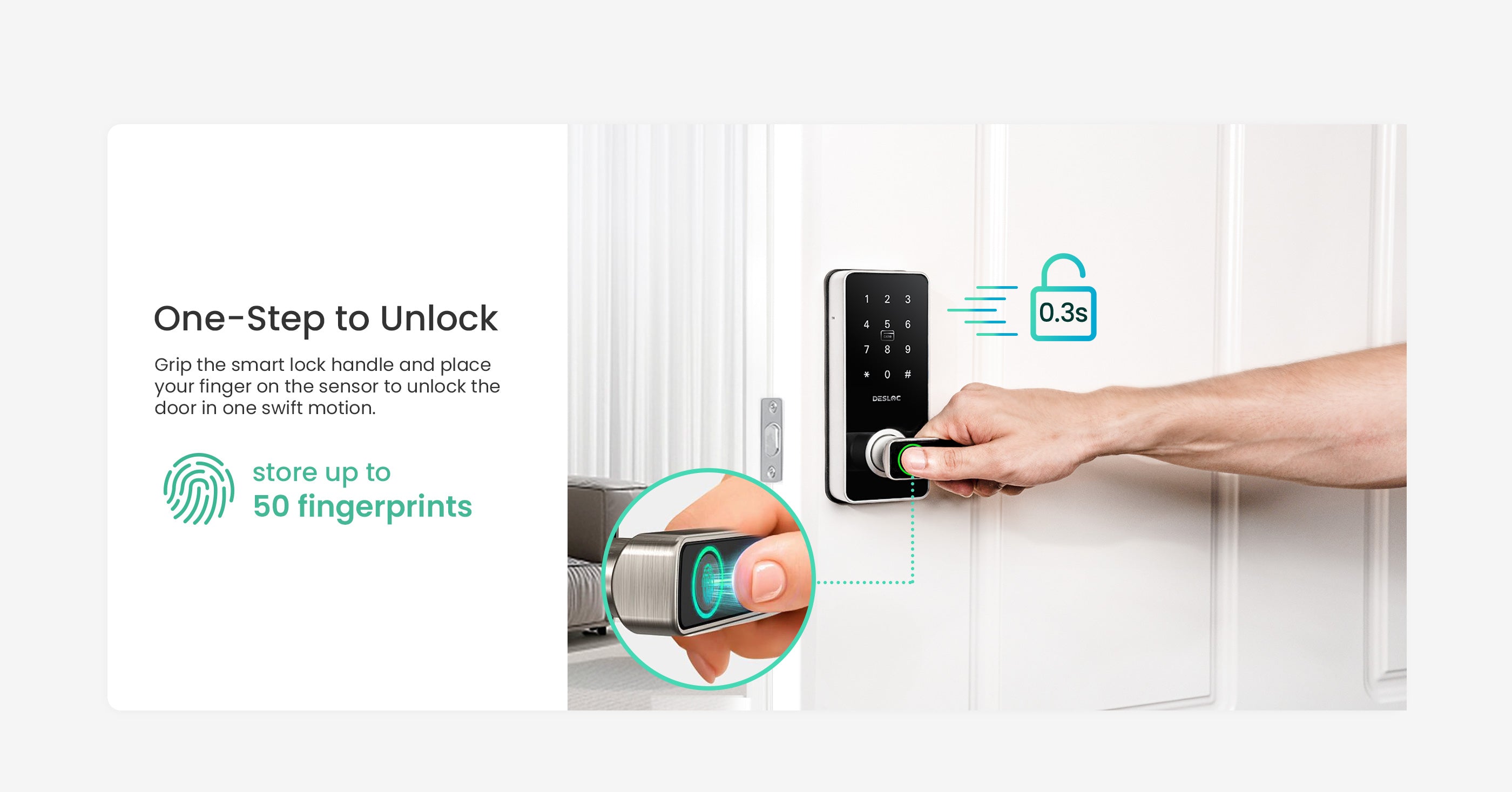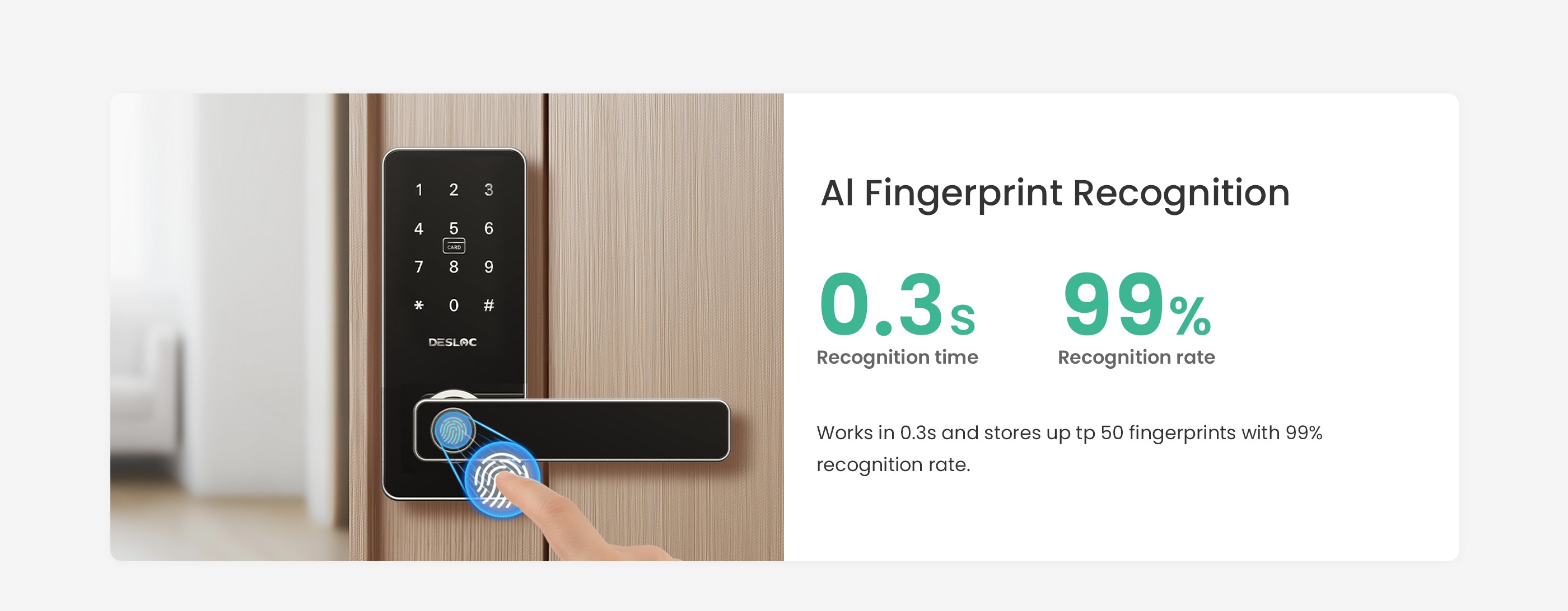 DESLOC uses advanced biometric tech for ultra-fast and accurate fingerprint scanning—recognize in less than 0.3 seconds. With encrypted fingerprint data, best fingerprint door lock B-Series ensures both convenience and high-level security.