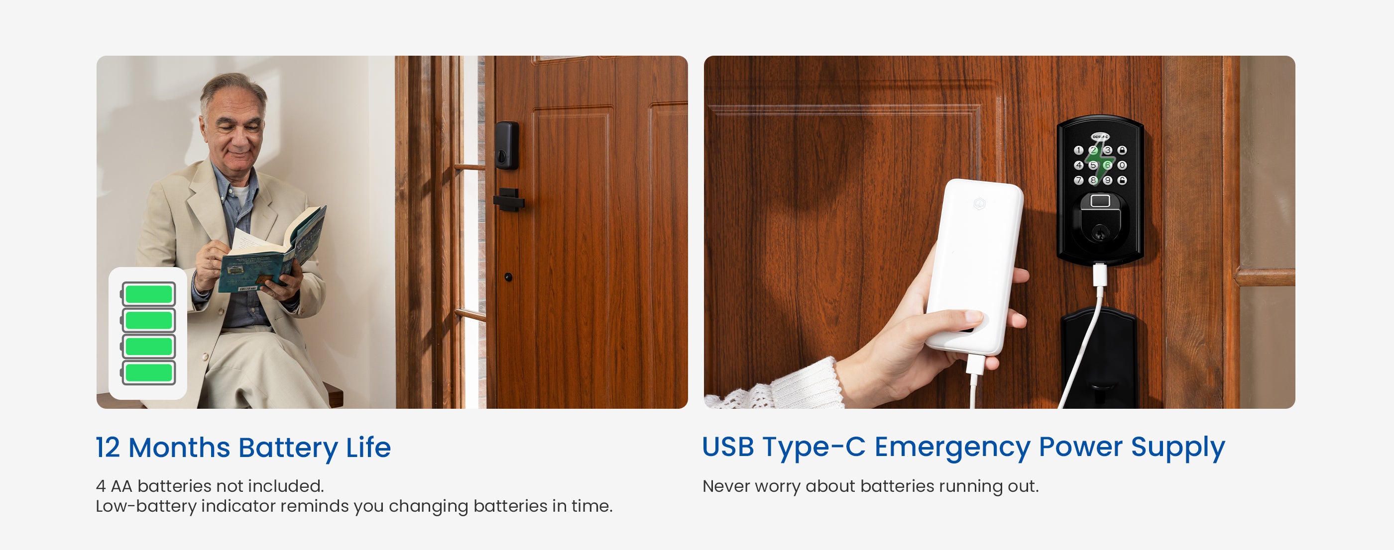 ๐๐ ๐๐จ๐ง๐ญ๐ก๐ฌ ๐๐๐ญ๐ญ๐๐ซ๐ฒ ๐๐ข๐๐: DESLOC fingerprint door lock is powered by 4 AA batteries (not included) lasting around 12 months with a built-in low-battery indicator and Type-C emergency power port.ย