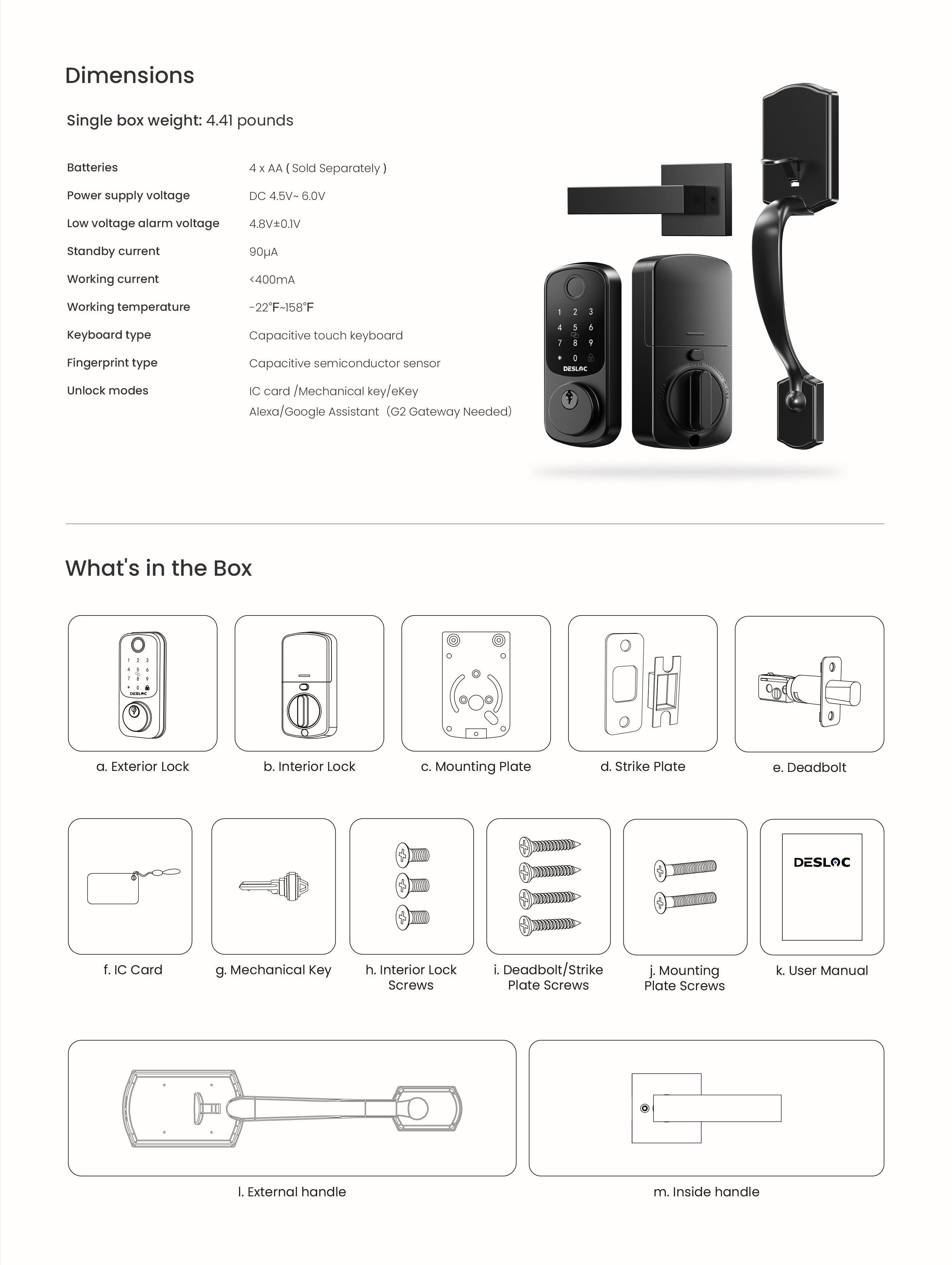 𝐄𝐚𝐬𝐲 𝐈𝐧𝐬𝐭𝐚𝐥𝐥𝐚𝐭𝐢𝐨𝐧 𝐚𝐧𝐝 𝐄𝐱𝐜𝐞𝐥𝐥𝐞𝐧𝐭 𝐂𝐮𝐬𝐭𝐨𝐦𝐞𝐫 𝐒𝐞𝐫𝐯𝐢𝐜𝐞: Install DESLOC fingerprint door lock in minutes by only a screwdriver. Interior lock back cover with adhesive for hands-free setup. DESLOC offers a 12 months product warranty and a lifetime after-sales service. Contact us via hotline (Mon-Fri, 9am-5pm EST) or 24/7 email support.