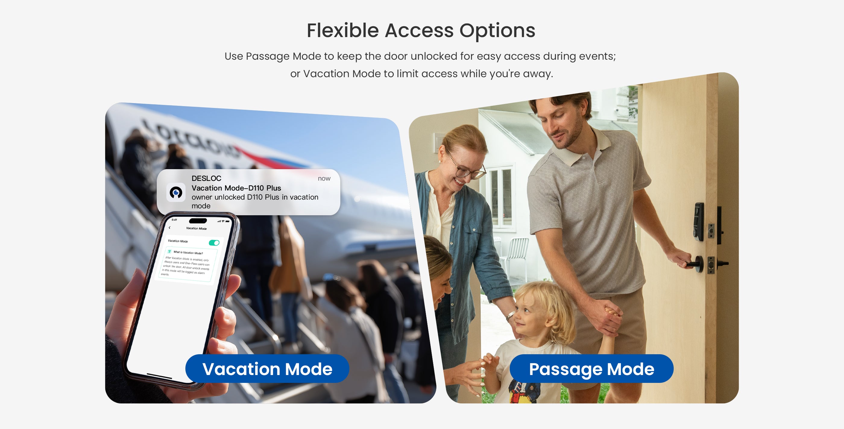 From everyday living to vacations, no one knows your lifestyle better than the DESLOC smart Wi-Fi door lockย for home. Enable Passage Mode for gatherings or switch to Vacation Mode to secure your home while away.