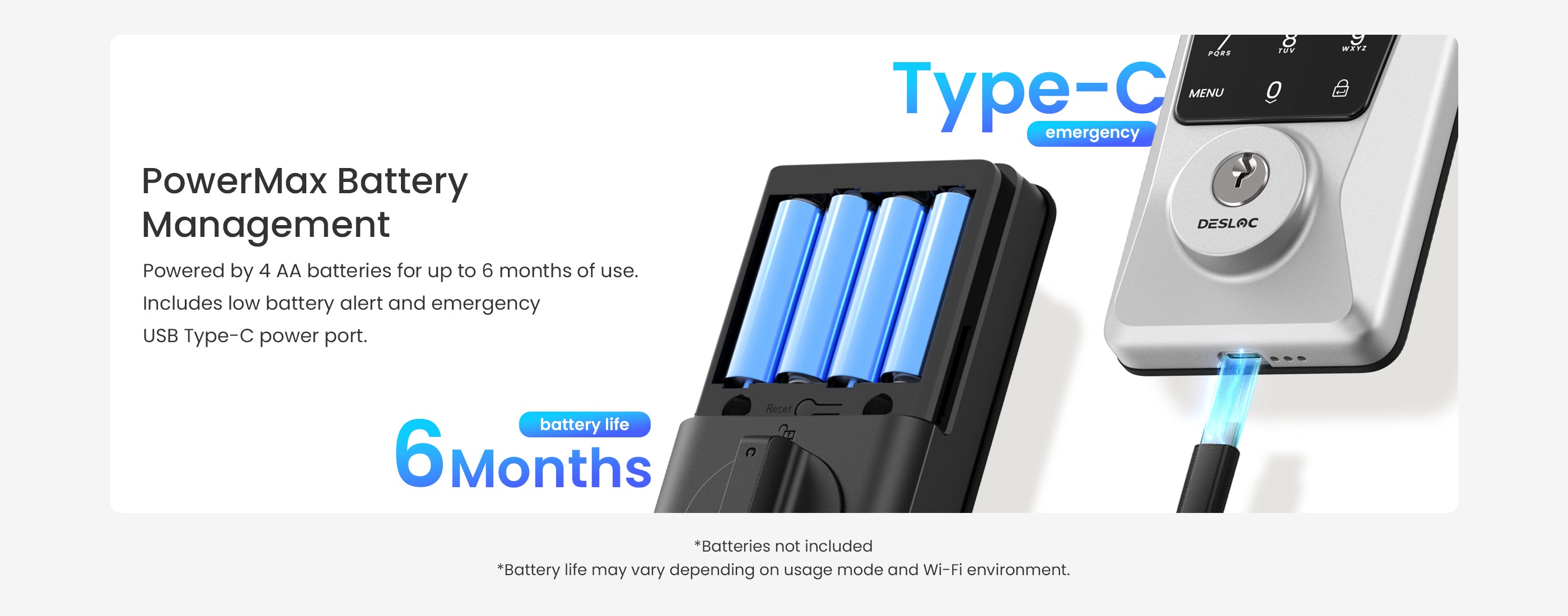 Powered by 4 AA batteries, our built-in Wi-Fi smart lockย delivers up to 6 months of performance. Low-battery alerts and a USBย TYPE-C emergency port keep you worry-free.