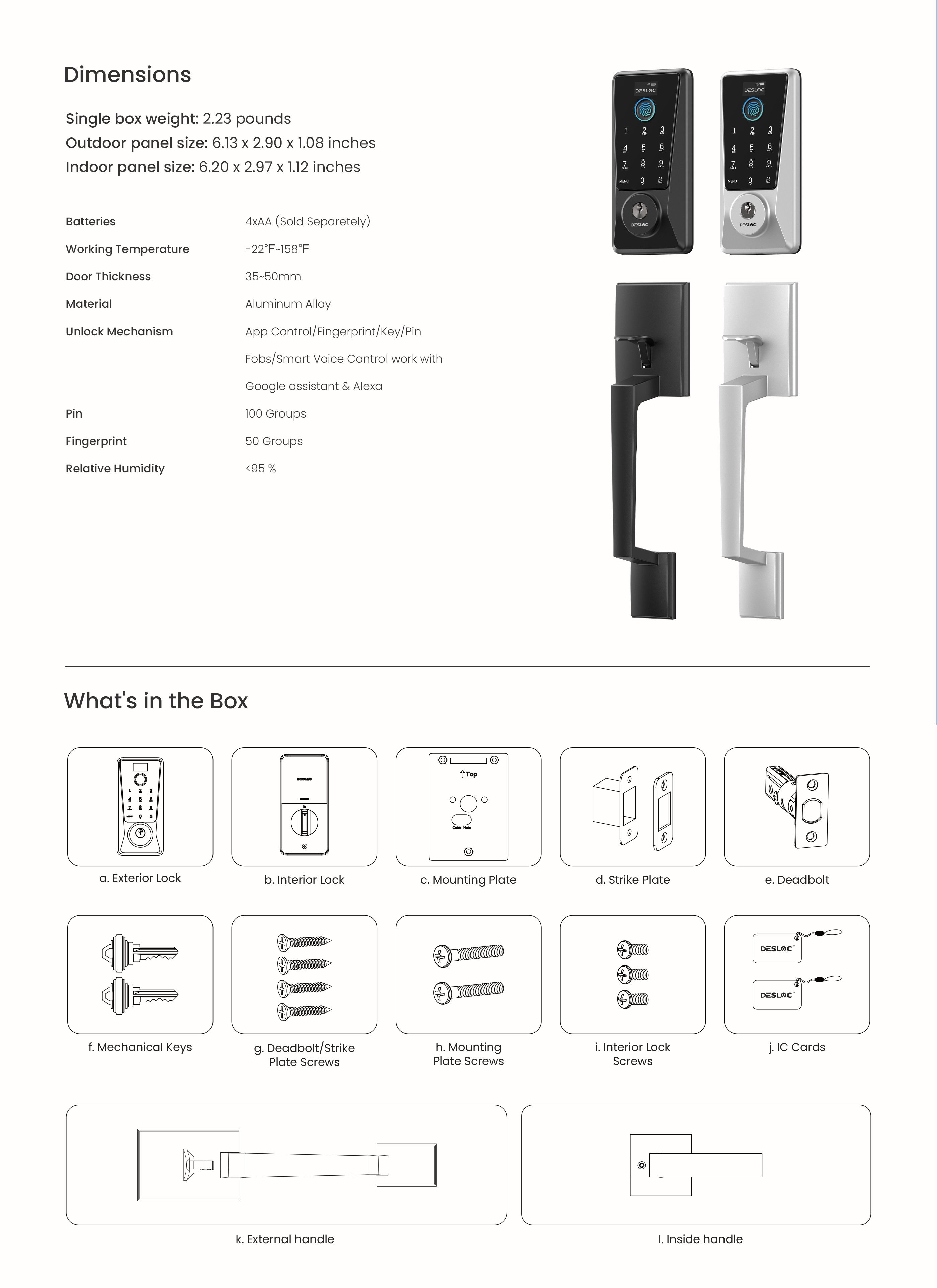 Installation is quick and DIY-friendly with just a screwdriver. The D110 Plus digital Wi-Fiย door lockย fits most standard U.S. doors with the following dimensions:
